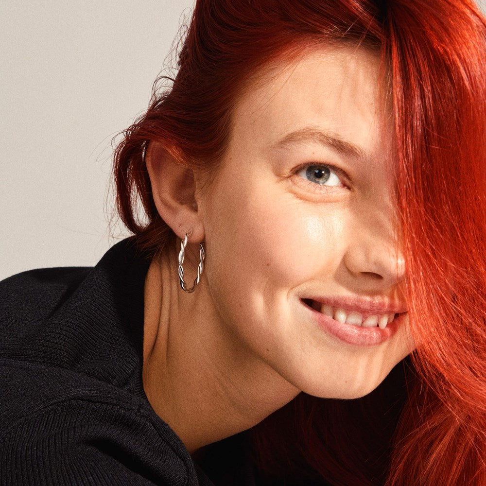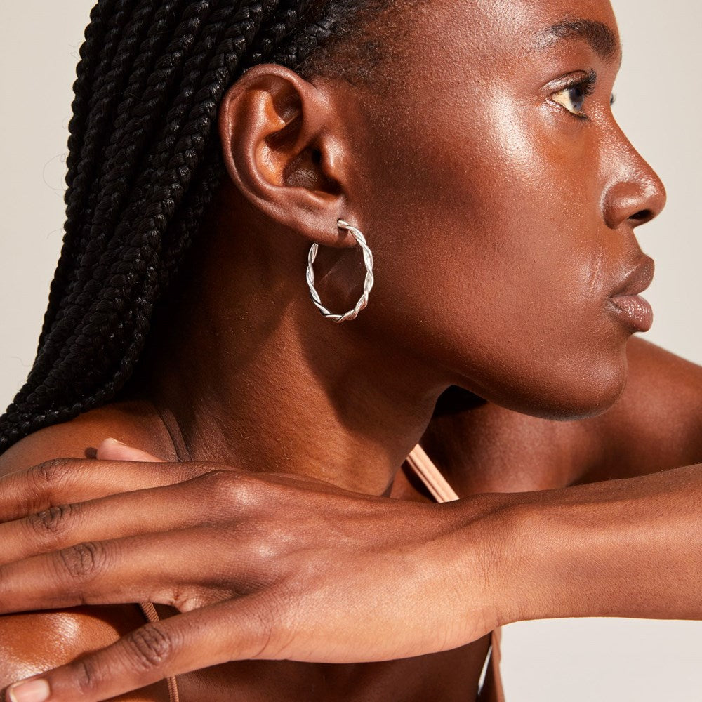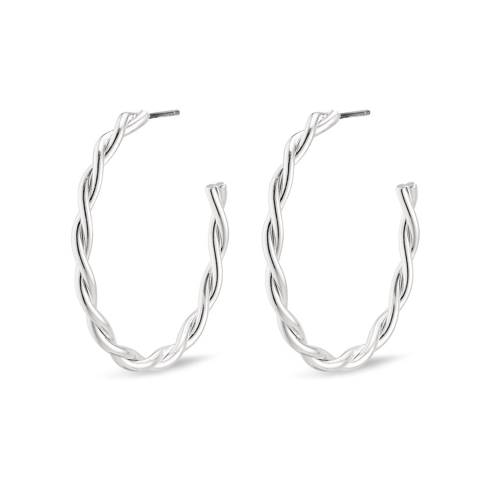 Stylish silver-plated hoops with a beautifully twisted ring. A chic variation on the classic hoop. The twists create beautiful light reflections in the silver-plated rings. Our twisted hoops are available in three sizes so you can find the ones that suit you and your unique look. Medium-sized hoops. A pair of earrings that will quickly become a favourite. Wear them alone or in combination with other beautiful Pilgrim earrings.
